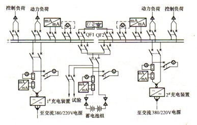 (3)方案三:單母線分段(一組蓄電池,兩套充電裝置)接線,見圖2-3。特點:接線可靠、靈活,一組蓄電池經(jīng)兩個空氣斷路器分別接到兩段母線上。兩套相同容量的充電裝置接在不同