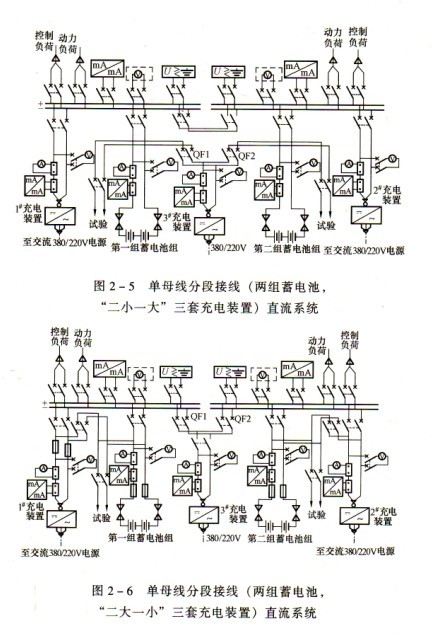 (5)方案五:單母線分段[兩組蓄電池,二小(1﹟2﹟充電裝置)一大(3﹟充電裝置)三套充電裝置,也可三套同容量]接線,見圖2-5。特點:接線可靠、操作方便靈活。每段母線設(shè)一組蓄電池和一套充電裝置,另設(shè)一套公用充電裝置,可用于任一組蓄電池充電。公用充電裝置是分別經(jīng)空氣斷路器QFl、QF2接到任一組蓄電池回路,充電裝置為二小(工作充電裝置)一大(公用充電裝置),即小的充電裝置按浮充電要求設(shè)計小容量,大的充電裝置按均衡充電要求設(shè)計大容量。每段母