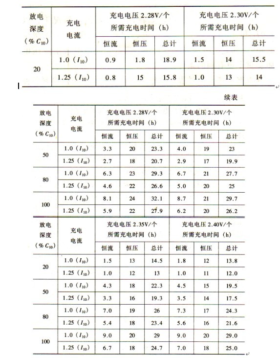 初充電一浮充電一均衡充電是按下列程序循環(huán)進行的。在投運前,對電池進行初充電,此時用恒流為l.Oll0進行充電。當單體電池電壓上升到2.35V轉(zhuǎn)為恒壓充電,此時充電流逐漸減少,然后轉(zhuǎn)為正常運行狀態(tài)即浮充電壓為2.25V。當運行720h后,進行均衡充電,即先以恒流l.Ollo電池充電,至電池電壓為2.35V轉(zhuǎn)為恒壓充電,電壓恒定一段時間又轉(zhuǎn)為正常浮充狀態(tài)。當交流電源中斷后,此時自動 進行均衡充電,以恒流l.Ol】o充電。電池電壓上升至2.35V后和上述運行初充后均衡充電的過程相同。上述兩階段充電,其浮充轉(zhuǎn)均充的判斷大多采用時間來整定,即不論放電幅度如何,一日由恒流階段轉(zhuǎn)入恒壓階段后,延時若干個小時,則自動轉(zhuǎn)為浮充。實際情況是充電所需時間與放電幅度有關(guān),如圖3-1所示。因此事故放電的深度是隨機的,若用一個固定的時間來操作,則有可能造成電池的過充或欠充,所以采用蓄電池回路的充電電流作為均充終期的判據(jù)是較合理的。不同放電深度后充電的所需時間見表3-1。表3-1    不同放電深度后充電所需時間