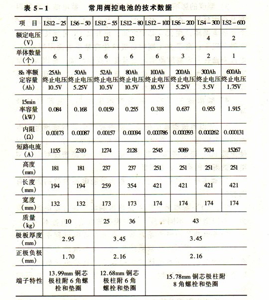 電池的內(nèi)阻就單體電池而言,主要由電解液、隔板和極板本身(極柵及活性物質(zhì))構(gòu)成。就電池組而言,單體電池之間的連接,以及極柱都是構(gòu)成電阻的重要部分,需進(jìn)行電壓降的計算。有時為了減小電壓降的損失,而采用銅芯鍍鉛的極柱。常用閥控電池的技術(shù)數(shù)據(jù)見表5—1。