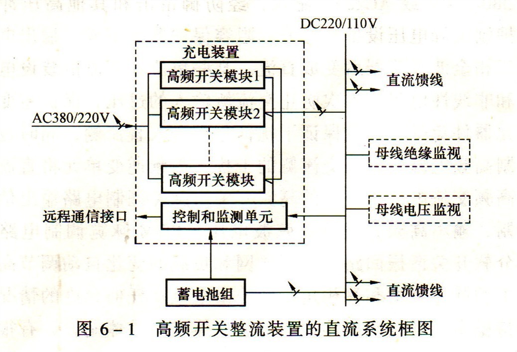 直流系統的蓄電池充電裝置根據負荷要求可為幾十安至幾百安。因高頻開關模塊目前生產的lIOV為10~80A,220V為5~40A,故充電裝置要由多個模塊并聯組成,高頻開關整流裝置的直流系統框圖如圖6-1所示。